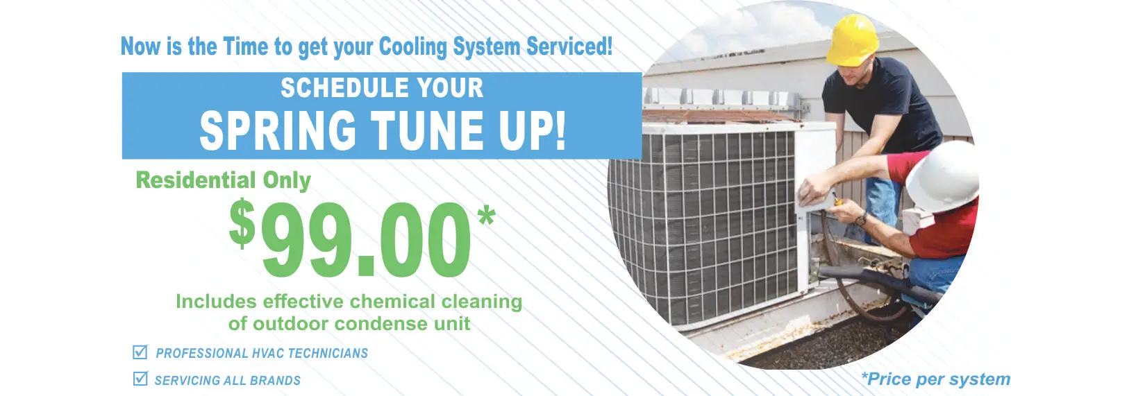 An AC System Tune Up is a preventive maintenance procedure performed to ensure the unit operates optimally and efficiently, especially before periods of high demand (such as Spring or Summer).